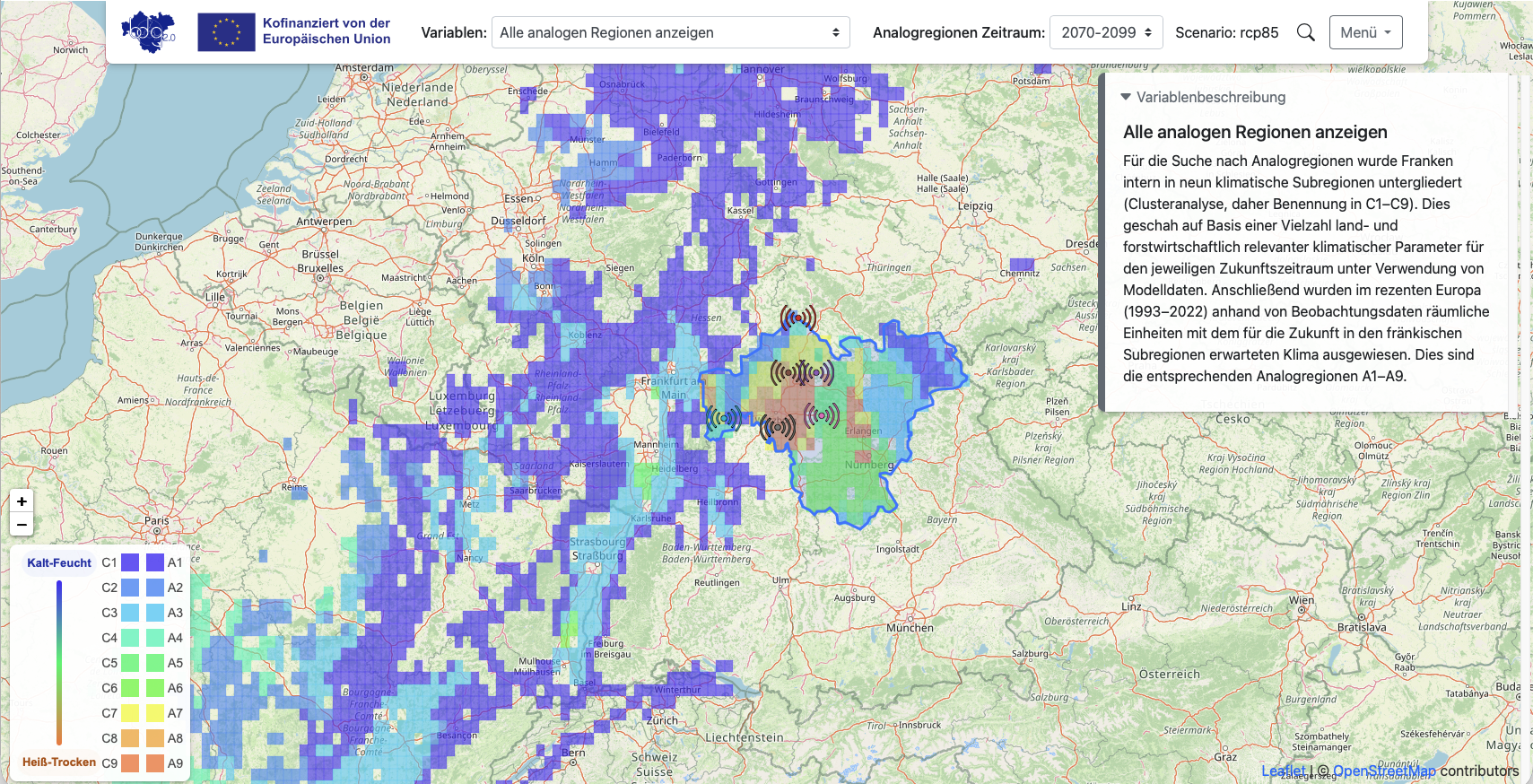 Im Vorgängerprojekt BigData@Geo haben Mitarbeitende der Julius-Maximilians-Universität Würzburg von 2017 bis 2022 unter Anwendung von innovativen Verfahren der Modellierung und Künstlichen Intelligenz (KI) ein interaktives webbasiertes Nutzerportal entwickelt und leicht zugänglich bereitgestellt, welches für den Agrarsektor in der Region Unterfranken relevante Indikatoren zum Klimawandel verfügbar macht. Dazu gehört zum Einen ein interaktiver Klimaatlas Klimaatlas, welcher Projektionen aus Erdmodellen für die Region Unterfranken übersichtlich darstellt. Des Weiteren wurden ein regionaler Klimabericht und eine zugehörige intelligente Suchfunktion erarbeitet, mit der natürlichsprachlich formulierte Fragen bezüglich des Klimaberichts direkt beantwortet werden können. So wurde die Möglichkeit einer langfristigen und nachhaltigen Planung für die 15 kooperierenden KMU stark vereinfacht und die Zukunftsfähigkeit der regionalen Wirtschaft unterstützt (mehr zum Vorgängerprojekt hier)