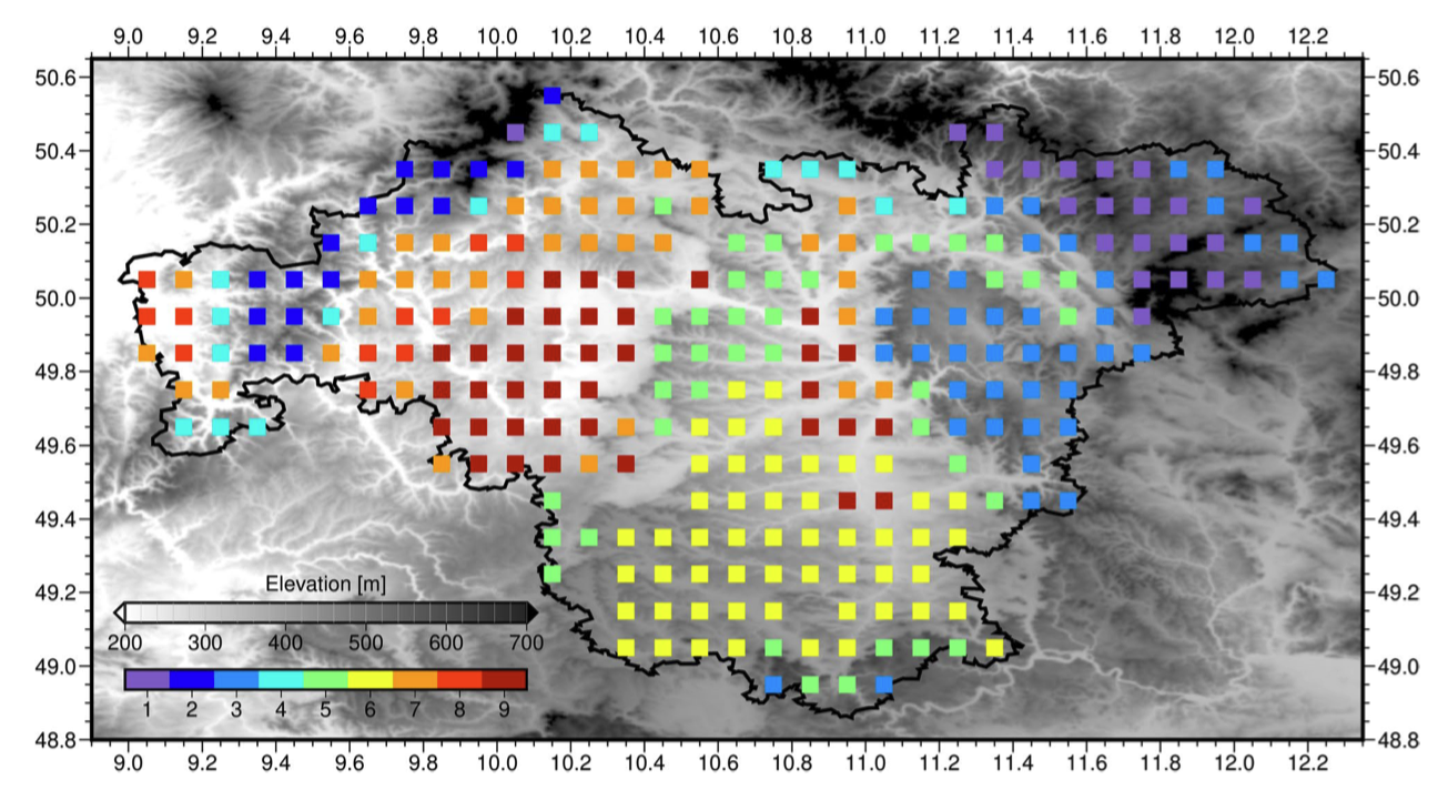 In der Studie „Undamped climate change poses the need for substantial shifts in cultivated crop types in Germany“ werden die zukünftig erwarteten klimatischen Veränderungen in Franken im Bezug auf die Landwirtschaft untersucht. Hierfür werden eine Vielzahl landwirtschaftlich relevanter klimatischer Kennwerte, simuliert durch ein biaskorrigiertes Ensemble regionaler Klimamodelle, verwendet. Anhand dieser wird Franken in Subregionen untergliedert und es werden Regionen in Europa gesucht, deren jetziges Klima dem am Ende des 21. Jahrhunderts in Franken erwarteten Klima entspricht. Anschließend werden die landwirtschaftlichen Anbauprodukte in diesen so genannten Analogregionen mit denen in den fränkischen Subregionen verglichen, um Hinweise auf mögliche zukünftige Veränderungen hinsichtlich der hier angebauten Feldfrüchte zu erhalten.